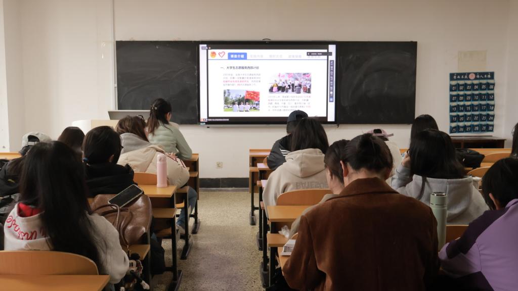 大学生志愿服务西部计划是由共青团中央、教育部、财政部、人力资源社会保障部共同组织实施的一项重大人才工程。宣讲中,陈宝军围绕项目介绍、实施内容、组织方式、政策保障等方面展开系统讲解,详细说明了西部计划的基本情况、报名条件和服务内容,并结合往届志愿者的真实案例,生动展现了志愿服务西部的实际生活状态,使同学们直观感受到西部计划的意义与价值。