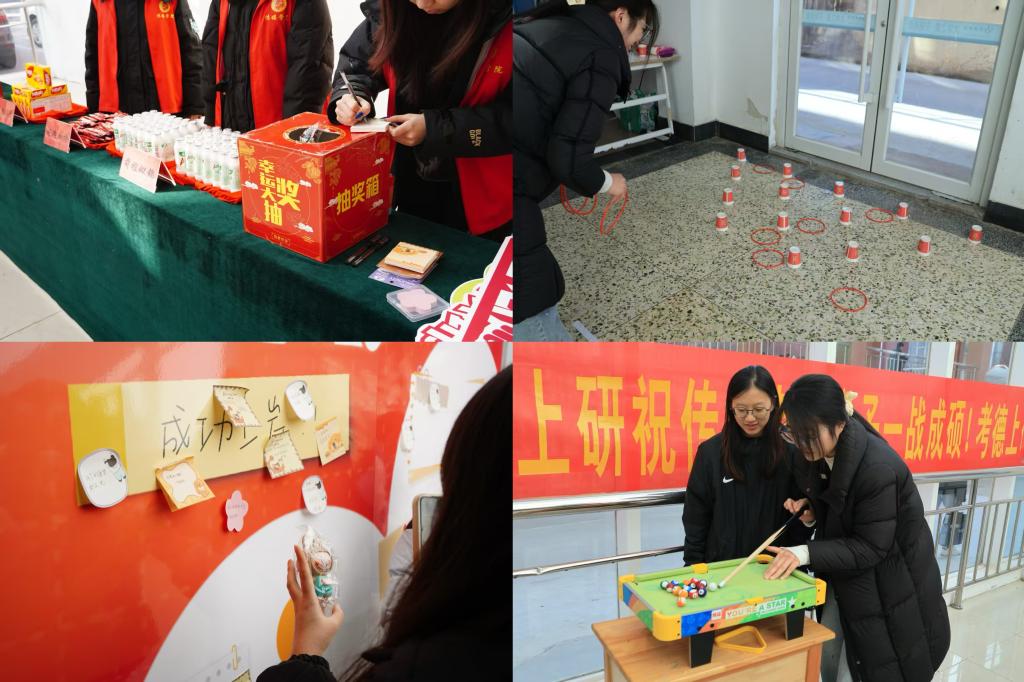除礼包发放外,活动还设置了多项互动环节。学子们在心愿墙上留下“成功上岸”“一战成硕”等期许,一张张便利贴汇聚成温暖的追梦力量;套圈、桌游等趣味小游戏也吸引了许多同学参与,现场还设置了抽奖环节,让大家在轻松愉快的氛围中缓解备考压力。